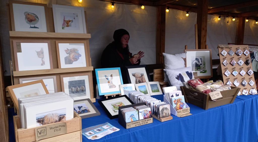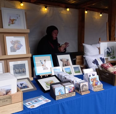 At our stall, you can find a range of our colourful art both mounted or framed and also our range of gifts inspired by the local wildlife, birds and farm animals. Every piece we create has it's own little back story - usually from a visitor to the garden or one of the many animals we come across on our local walks. Whether you're looking for something special for your home or a unique gift, you’re bound to find something that resonates with you.